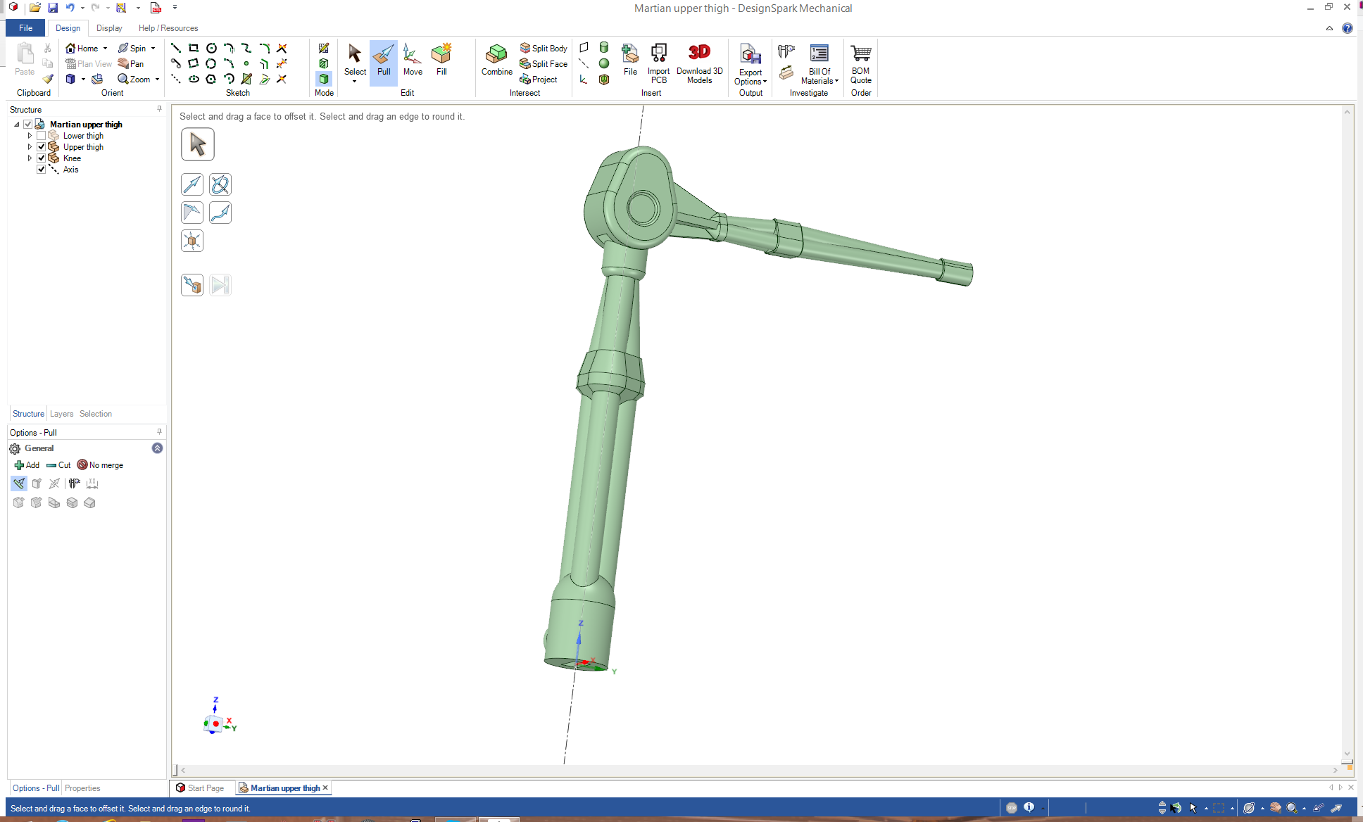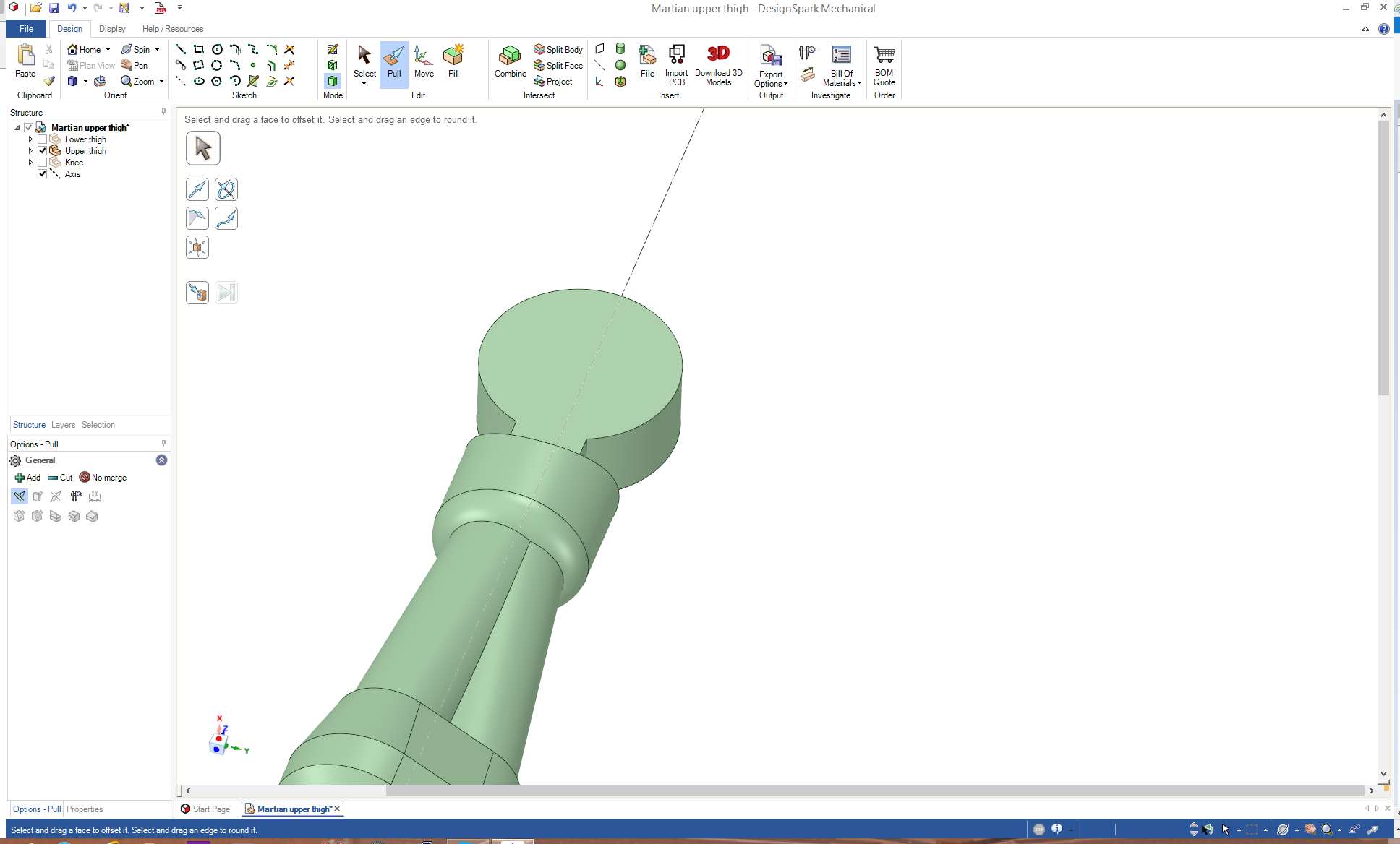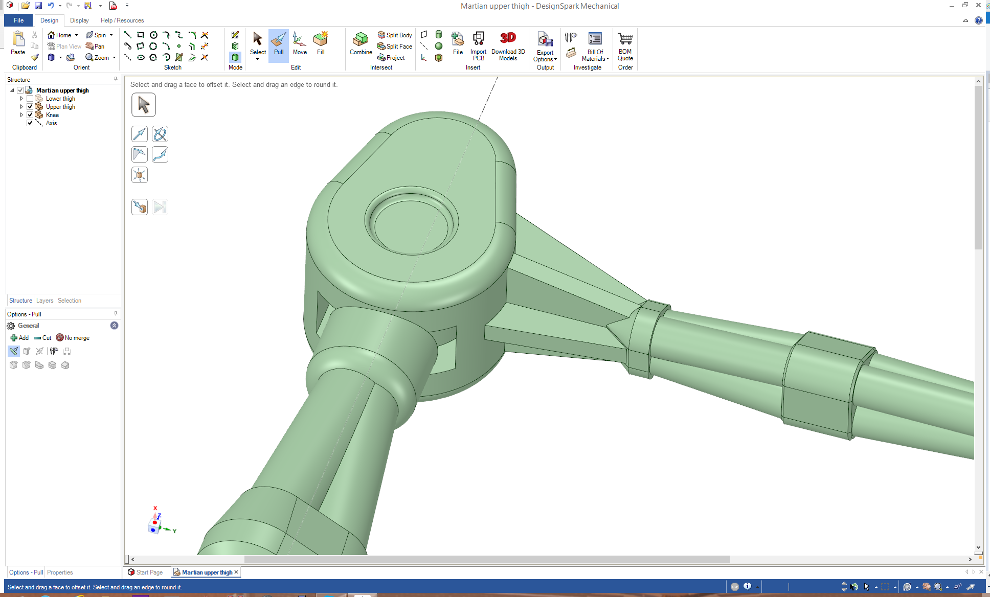 In a couple of cases, it probably would've been easier if I'd partially designed the next section before making the current one - in this case, I needed to modify the upper thigh (I'm still going to call it that for the time being), in order to make a nice joint for the knee (the bit above the knee I'm going to call the hip).