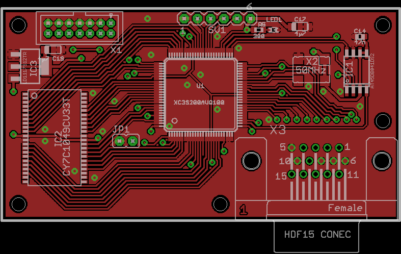 This is exactly the same width as the XilMezzie board, but is a bit longer to accomodate the VGA connector and SRAM chip.