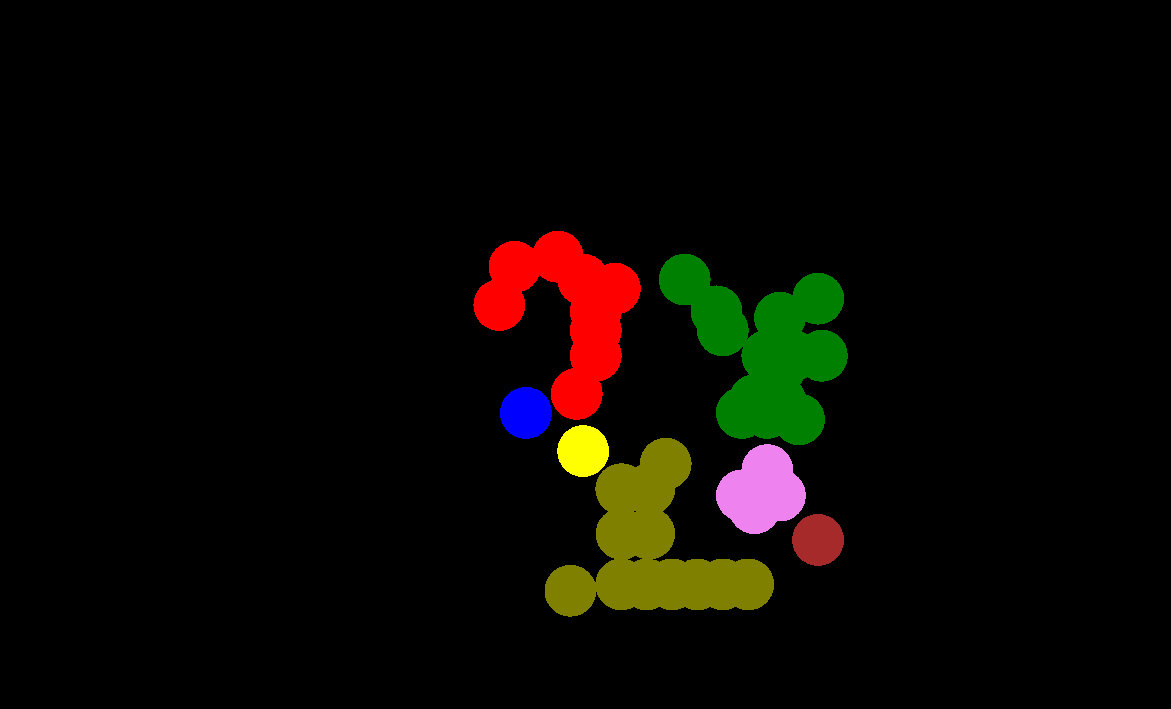 Using this particular radius, it has created 9 groups of points - some of which only have 1 point in them. It then looks at any grouping which has more than 10 points in it, and reduces the radius down until it has between 5 and 10 new groups. This is the magenta group in the bottom middle of the board: